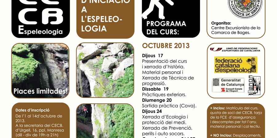 I es posarà en practica amb una matinal en una paret exterior que ens servirà per practicar la progressió en corda, una sotida a cavitat visitant a una bonica cavitat horitzontal, i una sotida de cap de setmana on visitarem dues grans cavitats de Catalunya